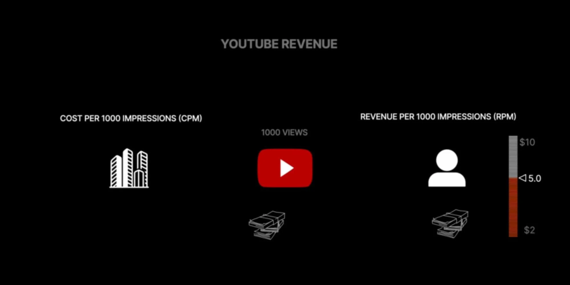 There are two important terms to understand when talking about YouTube AdSense. First is CPM Cost Per Thousand Impressions, the amount advertisers pay YouTube per 1,000 views on your video, and RPM Revenue per 1000 impressions, or how much you get from 1,000 views on your video. A typical RPM could range from $2 - 10$ for every 1,000 views.